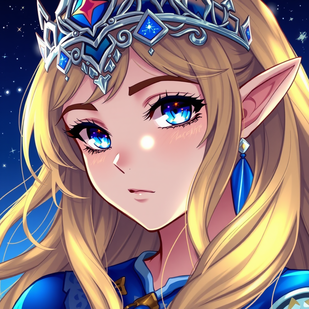 A close-up portrait of an anime girl with a sapphire blue dress and an intricate silver crown, her eyes reflecting the stars as a mystical aura surrounds her. Inspired by the Knights of Zodiac aesthetic, her expression is serene yet powerful, reminiscent of Princess Zelda's graceful strength. The illustration captures highly detailed, exquisite fanart, with flowing hair that cascades like liquid gold against a twilight backdrop. Her attire is adorned with celestial motifs, suggesting an air of regal fantasy. This digital anime artwork boasts meticulous, clean lines and vibrant colors, embodying the essence of Breath of the Wild's art style while adding a unique flair, the embodiment of an ethereal anime fantasy.