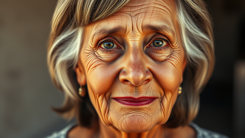 A close-up portrait of an elderly Hispanic woman with a medium-length hairstyle, her skin softly tanned and glowing under gentle, warm natural light. Her face, highly detailed, reveals a lifetime of stories and emotions, with expressive eyes that exude wisdom and warmth. Posed in serene surroundings that highlight her grace, the image captures every subtle nuance of her expressions in ultra-high-definition, 8K resolution.
