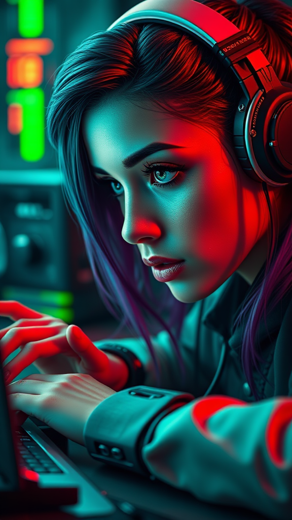 A close-up portrait of an imaginative female cyberpunk biohacker working diligently at her desk. The scene is enriched with a volumetric atmosphere, showcasing her beautiful face and elegantly poised hands. Captured with sharp focus and best quality, this high-resolution digital art is reminiscent of Artgerm's style, featuring vibrant neon colors and a Borderlands-inspired aesthetic. The composition is intricate and detailed, with precise linework that results in a breathtaking and comprehensive cinematic feel. Maximal detail ensures a 4k UHD experience, making it a key visual worthy of award-winning recognition and trending on platforms like CGSociety and ArtStation. Her mesmerizing eyes are captivating, and the entire artwork remains free of any distortions, errors, or artifacts that could detract from its perfection. There are no awkward anatomical missteps or unnecessary elements like weapons or sunglasses, maintaining the purity of the creative vision.