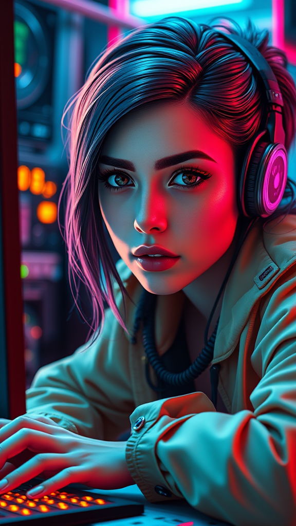 A close-up portrait of an inspired female cyberpunk biohacker at her workstation, crafted in the style of Artgerm, with a volumetric atmosphere and best quality sharp focus. The image is featured on CGSociety, showcasing a beautiful face and elegant hands in high resolution. The scene is vibrant with neon colors, evoking the style of Borderlands, and is intricately detailed with breathtaking precision. The line art is comprehensive and cinematic, with maximum detail in 4K UHD digital art, serving as a key visual piece. The work is award-winning and trending on Artstation, emphasizing her captivating eyes. There are no errors or distortions, with anatomy and proportions carefully depicted without any extraneous or missing features. The composition is pristine with no unwanted artifacts or clutter, capturing a clean and compelling vision of this innovative biohacker.