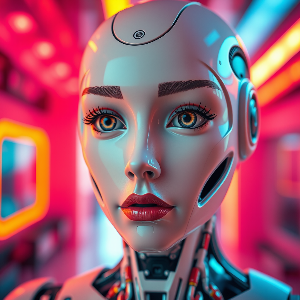 A close-up portrait of an intricately designed robotic girl, seamlessly blending android and humanoid features. Her detailed face showcases sophisticated robotic eyes, a precise robotic nose, and expressive robotic mouth and lips. The scene is set in an ultra-detailed, vibrant-colored futuristic room interior, giving a cinematic and futuristic feel. The composition highlights high contrast and vivid colors, providing an HDR effect. The robotic girl's expression is captivating, with big, human-like eyes and delicate eyelashes, imparting a girly and human-like charm. Her form is flawless, displaying a balance of robotic and human aesthetics. Note the harmony between technology and artistry, creating a professional masterpiece. The image encapsulates a perfect integration of cutting-edge robotics and human beauty, presenting a vision of futuristic elegance and technological sophistication.