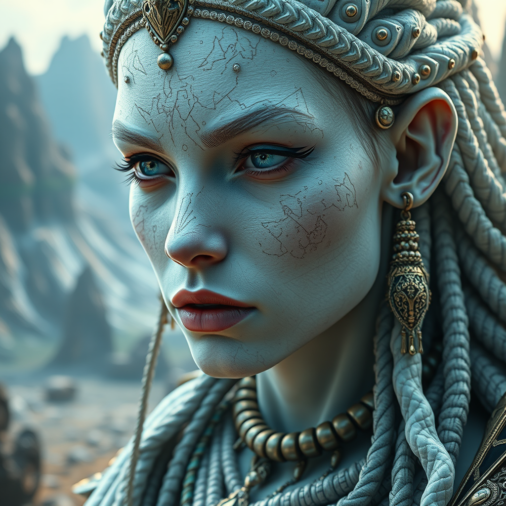 A close-up portrait of an otherworldly ancient queen with ethereal beauty, her white ash skin smooth and athletic form exuding powerful emotions. The artwork is vibrant and intricately detailed, capturing the essence of imaginative fantasy and science fiction themes intertwined with mythology. Set in an epic, surreal landscape that evokes a sense of adventure, the scene is a masterpiece of digital art with impressive graphics, intricate compositions, and fantastical elements that transport viewers into a world of extraordinary imagination, reminiscent of art by Julie Bell.