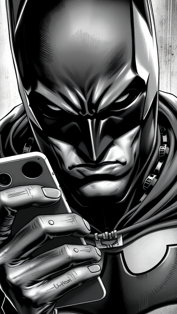 A close-up portrait of Batman holding a phone, captured in a dramatic black and white style that highlights realistic hyper-detail. The intense focus on Batman's expressions draws inspiration from artists like Rob Liefeld, George Stefanescu, and Nathan Wirth, adding a unique touch of close-up intensity to this superhero depiction. The composition, with an emphasis on shadows and textures, creates a powerful, iconic image of the Dark Knight, maintaining a balance of classic elements and innovative touches.