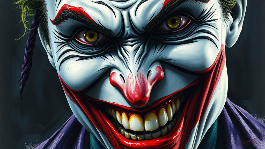 A close-up portrait of the Joker's face in Arkham Asylum, rendered in a captivating fusion of painting and illustration techniques. His expression is both unsettling and manic, with a grotesquely exaggerated grin and wildly sinister, deranged eyes with dilated pupils set against a dark, menacing background. The artwork combines bright acrylics, watercolors, and ink splatters to craft dynamic, textured images that capture the intense psychological darkness of the villain. The composition pushes the graphic novel form's boundaries, using distorted perspectives and jagged, expressionistic lines that evoke unease and disorientation, emphasizing the character's mental instability and the chaotic reality of the asylum.