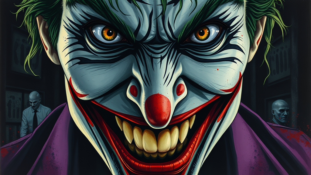 A close-up portrait of the Joker's face in Arkham Asylum captures an unsettling and manic expression, characterized by a grotesque, exaggerated grin and wild, deranged eyes with dilated pupils. The dark, ominous background intensifies the sinister atmosphere. Rendered in a captivating blend of painting and illustration, it utilizes bright acrylics, watercolors, and ink splatters to create dynamic, textured imagery that embodies the psychological depth and darkness of this villain. The artwork challenges the graphic novel form with distorted perspectives and jagged, expressionistic lines, evoking unease and disorientation, highlighting the Joker's mental instability and the chaotic reality of the asylum setting.
