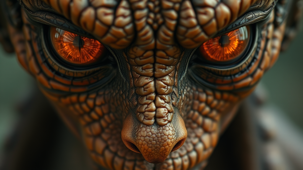 A close up portrait that embodies the essence of sorrow, exuding an aura that is heavily exaggerated beyond human form, featuring very detailed dark amber orange reptilian humanoid eyes; its presence is ethereal, existing only in the imagination, yet feels strikingly familiar to the human form, evoking a sense of unsettling beauty. The texture is reminiscent of Julie Bell's dynamic and rich coloring, intertwined with H.R. Giger's surreal, biomechanical elements, capturing a hauntingly beautiful, otherworldly visage that feels both alien and poignantly human.
