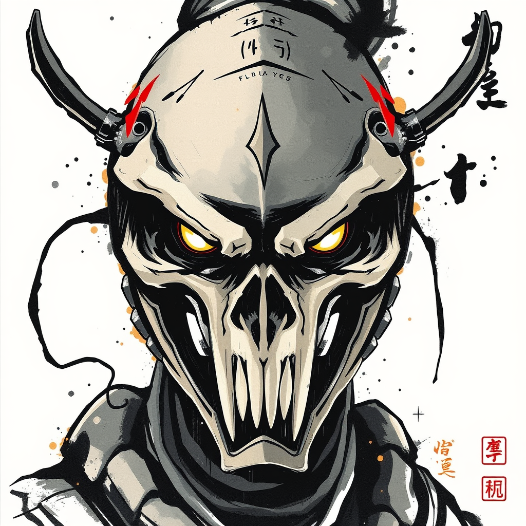 A close-up portrayal of a fearsome character inspired by Scorpion from Mortal Kombat, featuring a skull-like visage with dull, lifeless warm white eyes. The image is crafted in an ink artistic style, incorporating abstract elements and mosaic-like typography. The palette consists of complementary colors, designed with simplicity in a mosaic of characters and evoking the aesthetics of Chinese painting on a white background, resulting in a striking yet harmonious wallpaper-style composition.