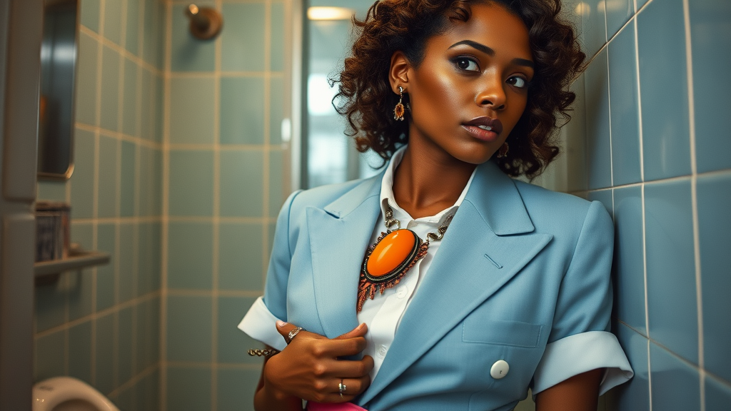 A close-up retro FlicFilm Elektra 100 photo captures a sophisticated model in a muted pastel blue western suit paired with a crisp white short-sleeved shirt and a distinctive bolo tie adorned with a striking orange stone. The model, showcasing radiant dark skin and curly brown hair, looks contemplatively to the side, enhancing the allure of mystery. Their elegance is accentuated by statement ring earrings and tasteful jewelry, with one hand gracefully poised near their face. A touch of vibrant fashion flair is added by a pink Italian leather belt which cinches the outfit together. This stylish scene unfolds within a quaint vintage restroom, exuding a sense of avant-garde charm reminiscent of French Vogue editorials influenced by the signature aesthetic of Jacquemus.