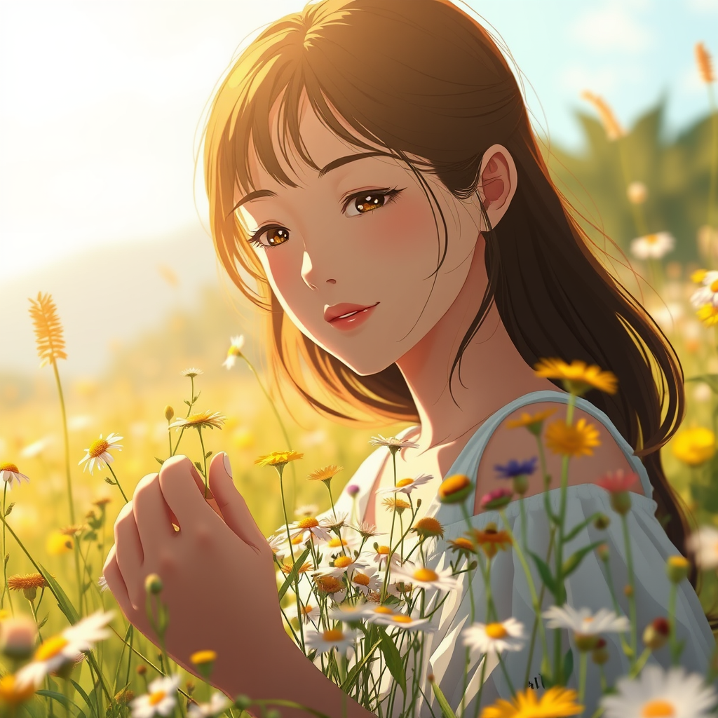 A close-up scene capturing the serene essence of a beautiful woman gathering an assortment of wildflowers in a sun-drenched meadow, depicting the tranquil moments of summer at dawn in an anime style. Her gentle expression and delicate posture are highlighted, as she embodies a sense of peace and elegance amidst the vibrant flora. The warm golden hues of the morning light envelop her figure and the surrounding landscape, painting a picture of quiet harmony and natural beauty.