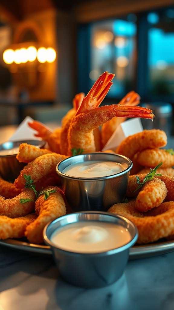 A close-up shot captures a luxurious and elegant fried shrimp platter with mouth-watering tartar sauce. The composition is centered, showcasing the indulgent gourmet elements in a high-end food photography style. The clean arrangement and dramatic lighting highlight the tempting textures and flavors. Shot with a Nikon Z7 at a focal length of 105mm, the image benefits from soft directional lighting, enhancing its visual appeal. Styled by a professional food stylist, the scene is set in an interior space during the evening, exuding a sophisticated and inviting atmosphere.