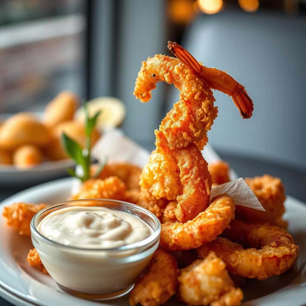 A close-up shot in the gourmet genre captures a tempting scene of a fried shrimp platter paired with a creamy tartar sauce. This high-end food photography piece showcases a clean composition with dramatic lighting that highlights the luxurious and elegant feel of the dish. The mouth-watering presentation and indulgent textures bring a gourmet touch to the imagery. The shot, taken with a Nikon Z7 at a focal length of 105mm, is centered and features soft directional light that accentuates the golden crispiness of the shrimp. Styled by a professional food stylist, this evening interior setting adds warmth and allure to the scene, creating an inviting and sophisticated atmosphere.