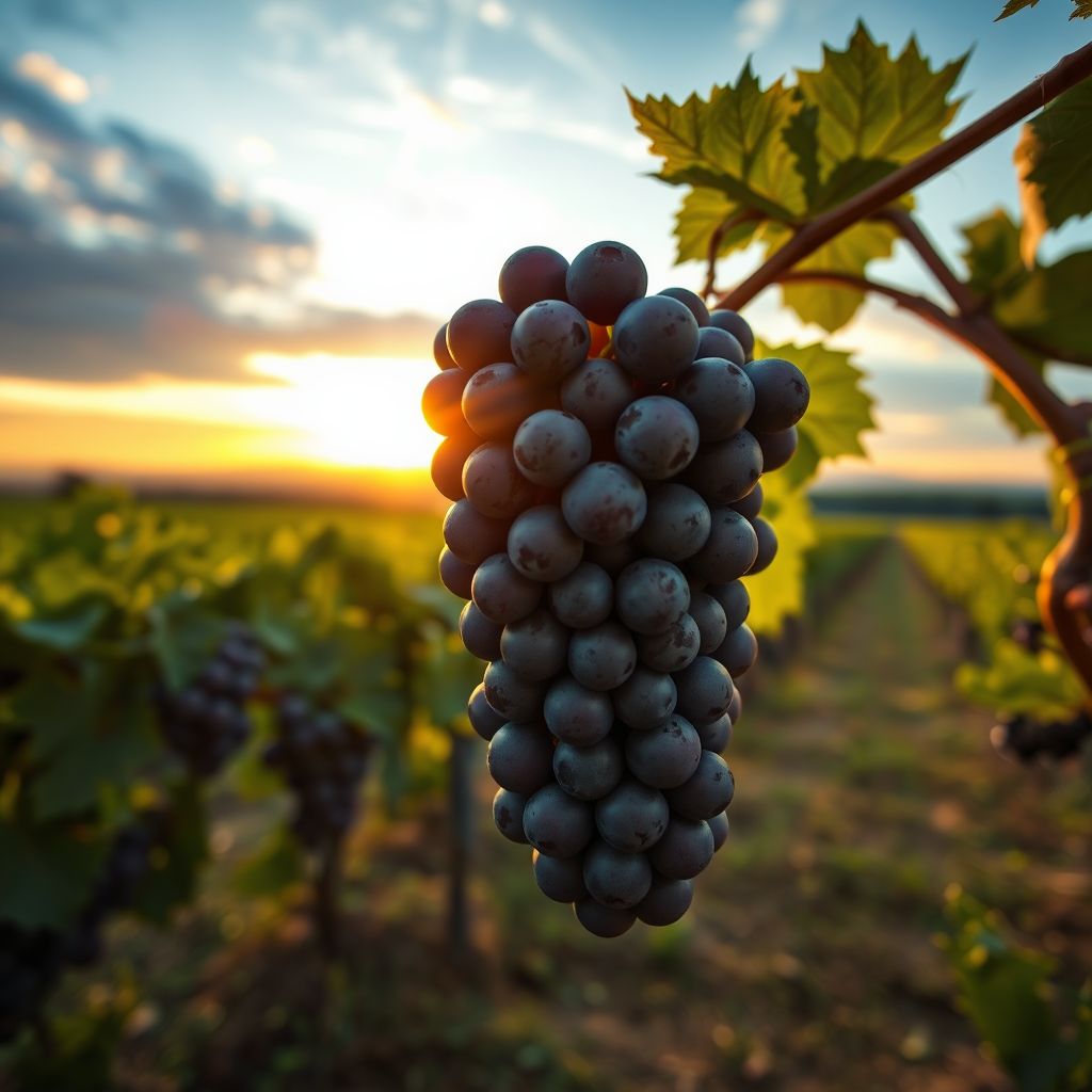 A close-up shot of a large cluster of grapes glistening under the warm hues of a setting sun in a lush vineyard, showcasing the expansive grape fields with a breathtaking skyline backdrop, reminiscent of Phil Koch's award-winning photography style, with intricate details and subtle artistic modifications.