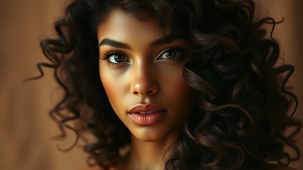 A close-up tondo portrait of a model with thick, curly dark hair, styled in a way reminiscent of daz3d artistry. The composition exudes a hazy ambiance, with wavy patterns intertwining throughout the image. The predominant color palette features rich, earthy browns, infusing warmth and depth. The visual texture echoes the classic charm of ferrania p30 film, blending nostalgic grain with modern elegance, resulting in a stylized and captivating portrayal that enchants the viewer.