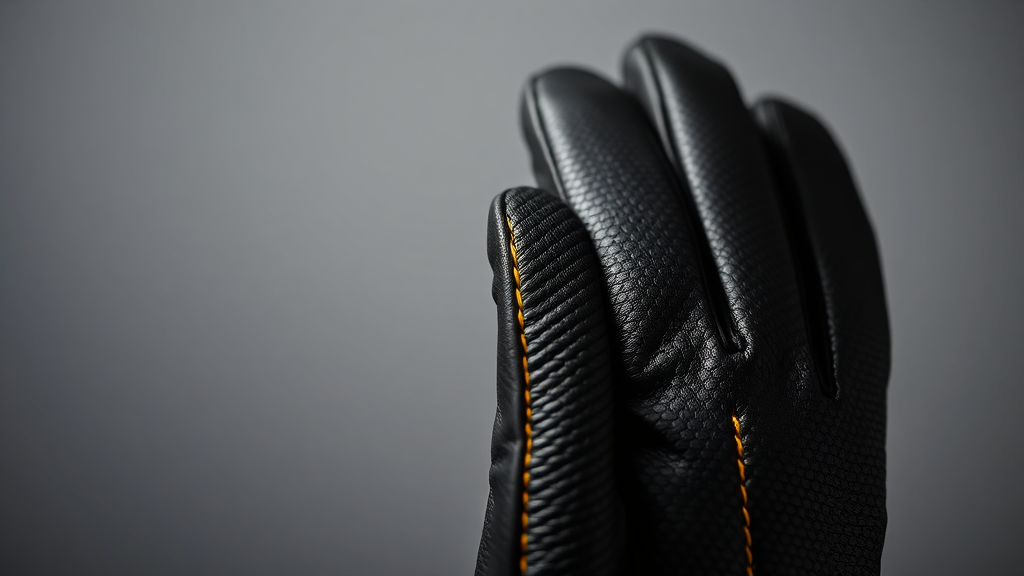 A close-up view of a finely crafted pair of minimal gloves, designed with a textured matte black leather surface, showcased in a subtle dark grey hue. A striking yellow stitch serves as a focal point against the intricate leather pattern. Captured with a macro lens set to f/5.6, the image emphasizes the detailed craftsmanship through a play of shadows and highlights. The lighting is expertly controlled to cast a defining shadow, enhancing the texture against a muted grey studio backdrop.
