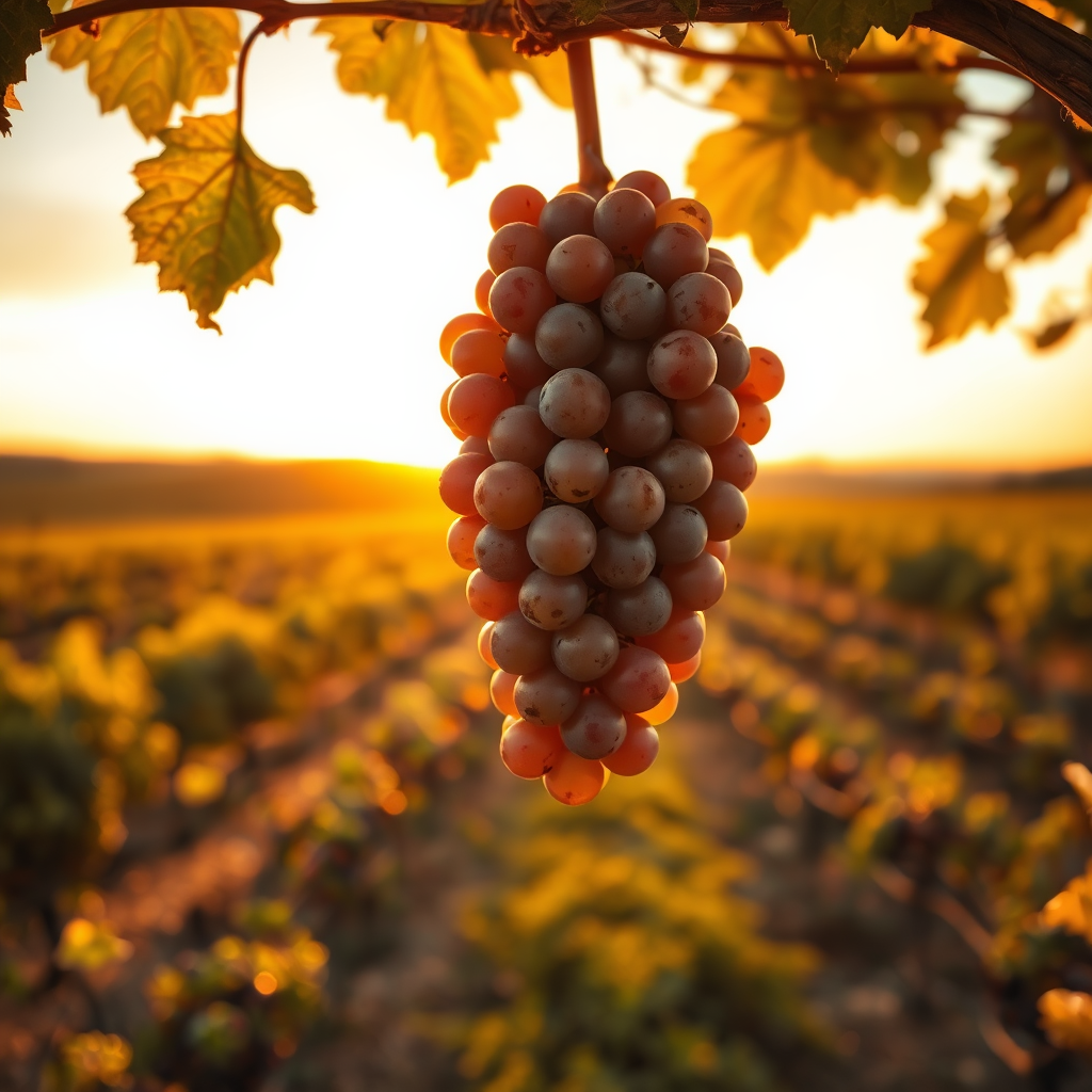 A close-up view of a large cluster of grapes hanging from a vine, basking in the golden glow of a vineyard at sunset. The sprawling grape field stretches into the horizon, the skyline painted with warm hues. The intricate details of the grapes and vines are captured with extraordinary precision, reminiscent of Phil Koch's award-winning photography. Subtle variations in color and texture bring life to the scene, adding a unique touch to the classic vineyard landscape.