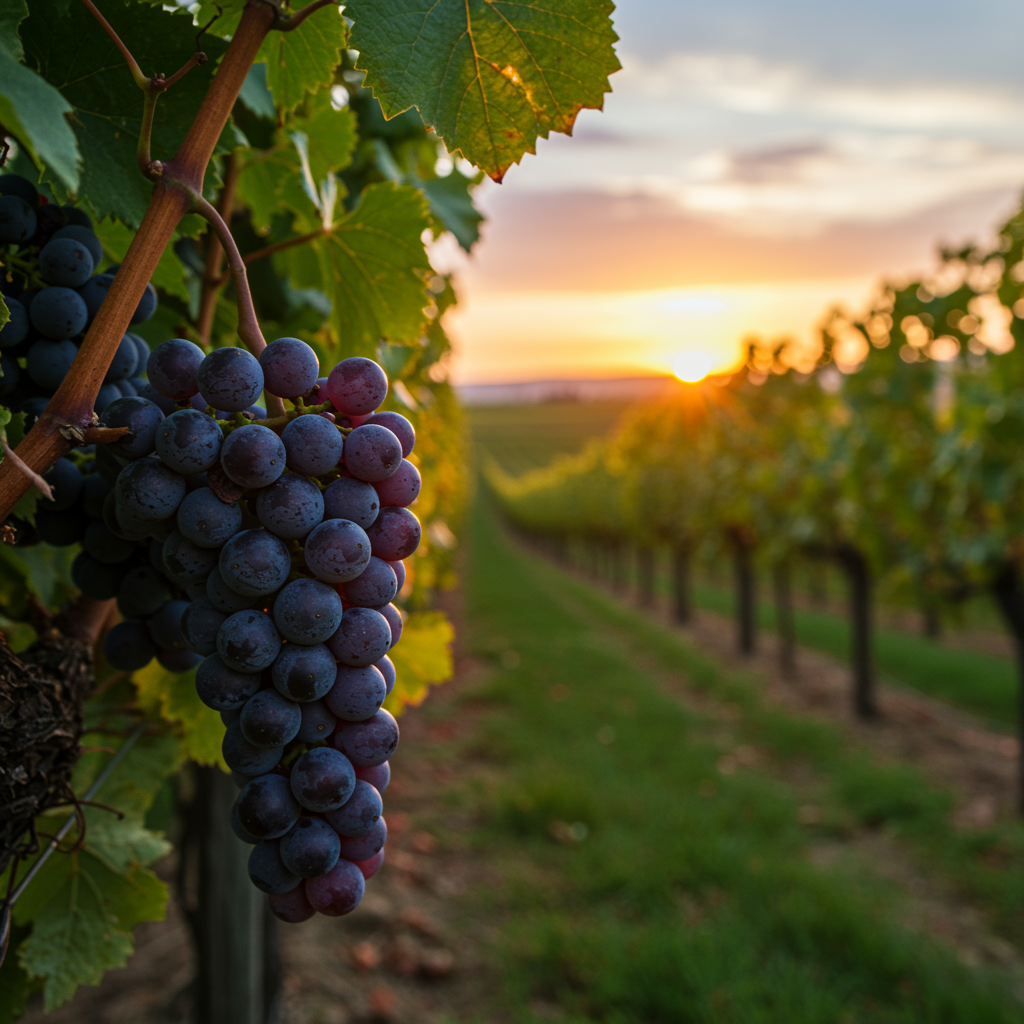 A close-up view of a large cluster of grapes hanging low from a vine in a sunlit vineyard, the horizon bathed in the warm hues of sunset, capturing the tranquility of the fields with a breathtaking skyline, inspired by the artistry of Phil Koch, renowned for his exceptional detail and evocative landscapes.