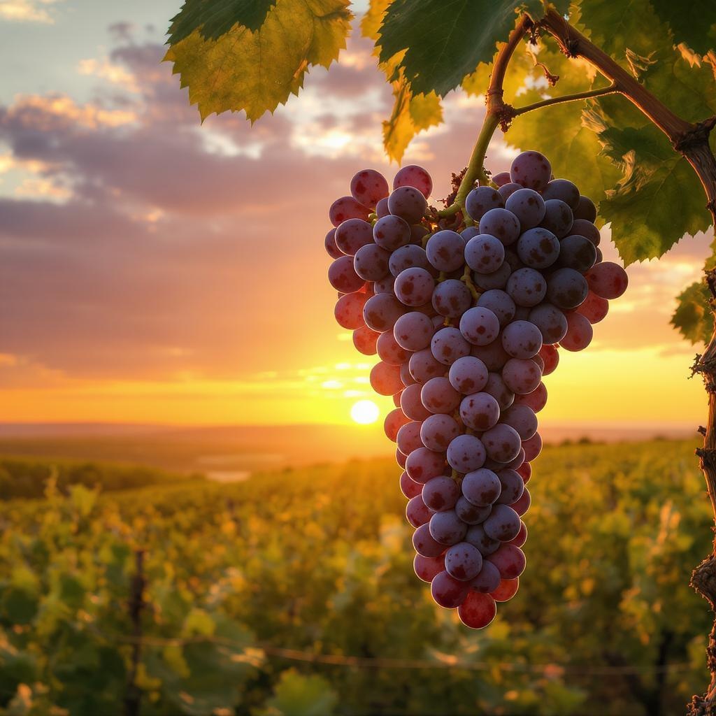 A close-up view of a large cluster of grapes hanging from a vine, bathed in the warm, golden glow of a vineyard at sunset, stretching towards an expansive skyline. The scene is reminiscent of Phil Koch's award-winning photography, with an emphasis on extreme detail and subtle creative nuances, capturing the harmonious blend of nature's bounty and the serene, colorful horizon.