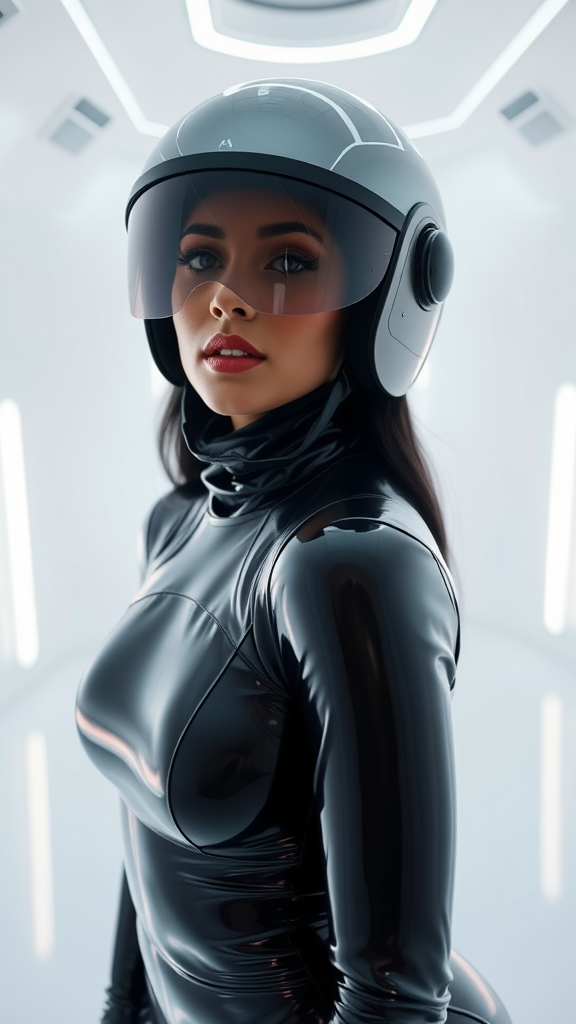 A close-up view of a woman dressed in a sleek black latex ensemble and a mirrored visor helmet, positioned in a stark white, minimalist room exuding a futuristic atmosphere, illuminated by soft, ambient lighting. Subtle neon accents glow faintly, casting iridescent reflections across the glossy surfaces, adding an element of mystery and allure to the scene.
