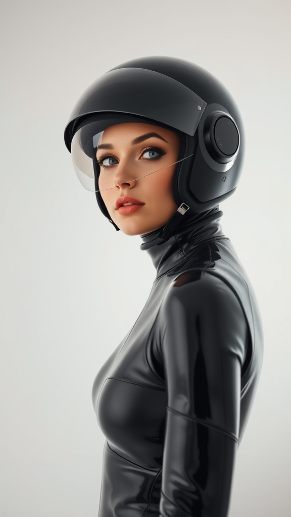 A close-up view of a woman in a sleek black latex outfit paired with a reflective full-face helmet, positioned in a stark white minimalistic space exuding a futuristic ambiance, bathed in diffused soft light. Her stance conveys confidence and mystery, with subtle reflections of ambient light glinting off the glossy surfaces of her attire and helmet, contrasting against the room's pure white backdrop. The environment features smooth, curved lines and subtle technological elements, enhancing the avant-garde aesthetic.