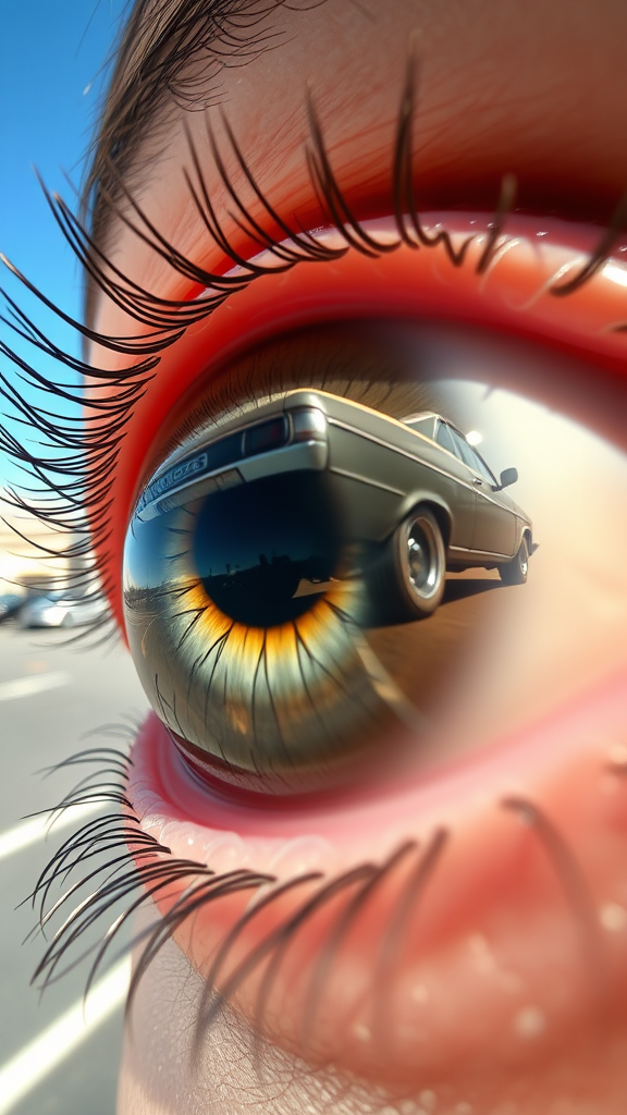 A close-up view of an eye with a clear reflection of a lowrider car bouncing as its hydraulics are activated, set against a background of bright blue skies and a parking lot. The image captures perfect anatomy, high definition, photorealism, and intricate detail in a fully focused 8K macro shot. The scene is complemented by elements of Poorly Made 3D art, with unrealistic distortions, unattractive tiling, unfocused and awkwardly positioned limbs, unclear and blurred outlines, flawed anatomy, visible graininess, ambiguous framing, and poorly executed composition without any watermarks or signatures.