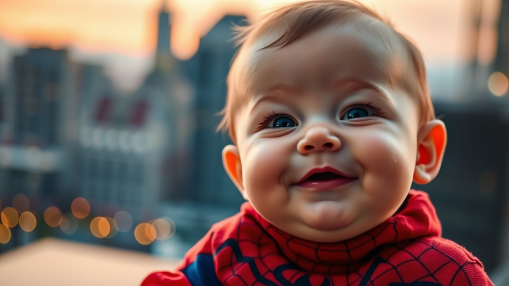 A closeup of a baby with a whimsical expression, wearing a tiny, adorable Spiderman suit with vibrant colors and intricate web patterns, set against a softly blurred cityscape background that features twinkling lights in the early evening, highlighting the playful contrast between the innocence of the infant and the grandeur of the urban environment.