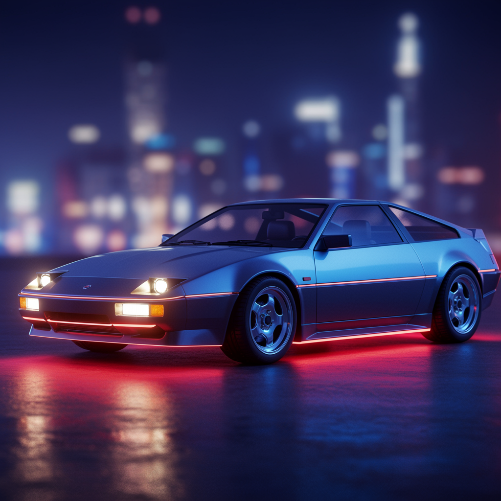 A closeup view of a sleek retrofuturistic sportscar bathed in neon hues, sporting chrome accents and a glow from undercarriage lights, set against a blurred cityscape backdrop to enhance its dynamic design, evoking a sense of speed and innovation.