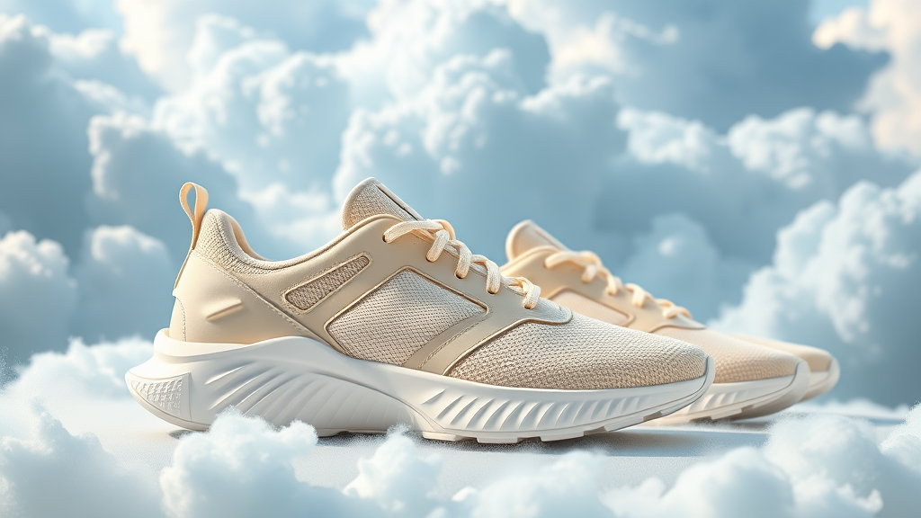 A collection of cream-toned running sneakers, elegantly crafted in collaboration between Kanye West and Jacquemus, showcasing luxury and sophistication. The design is complemented by a backdrop of ethereal, fluffy blue clouds, illuminated with soft volumetric lighting. Captured in an octane render, the product shot highlights the intricate, high-detail craftsmanship, with an 8k resolution for a high-definition look that exudes exclusivity and style.