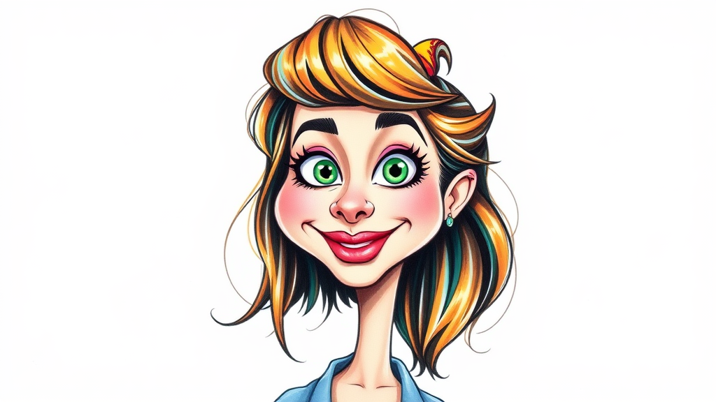 A colorful caricature pencil drawing of a cute woman in her mid-20s, featuring Pixar-style charm with hilariously exaggerated features, vibrant color pencils, set against a bright white background, infused with whimsical chaos and high stylization.