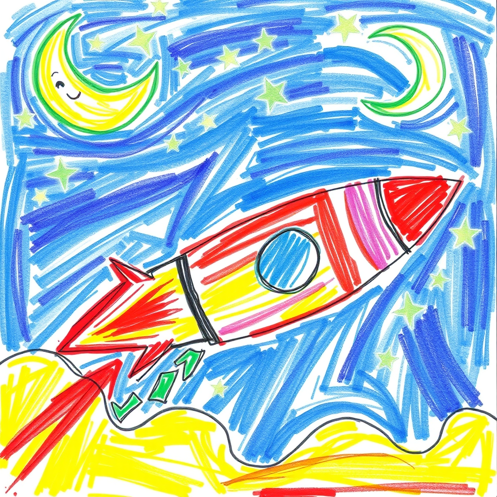 A colorful child's crayon drawing depicts a whimsical rocket ship blasting through a starry sky, with a crescent moon smiling in the background; the rocket is endearingly askew with wobbly lines and playful bursts of color, showcasing the vibrant imagination and unrefined artistry of a young artist using Crayola crayons.