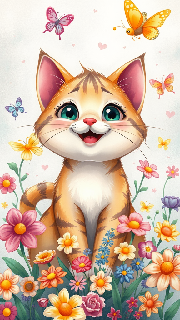 A colorful illustration features an adorable cartoon cat, its eyes sparkling with joy as it playfully looks at the viewer, surrounded by a vibrant array of whimsical flowers and floating butterflies.