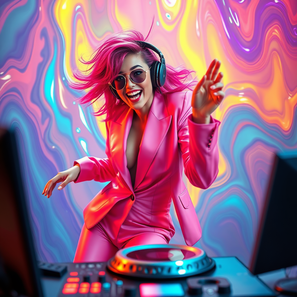 A colorful scene featuring DJ Chickie in a vibrant pink suit, enjoying her music with joyful energy, showcasing her animated, happycore spirit. The setting is dynamic and fluid, with elements of liquid metal and wavy patterns blending together, capturing a feminine form in motion. The style embodies a video-like presence, influenced by pigeoncore aesthetics, with a raw, unapologetically vivid texture.
