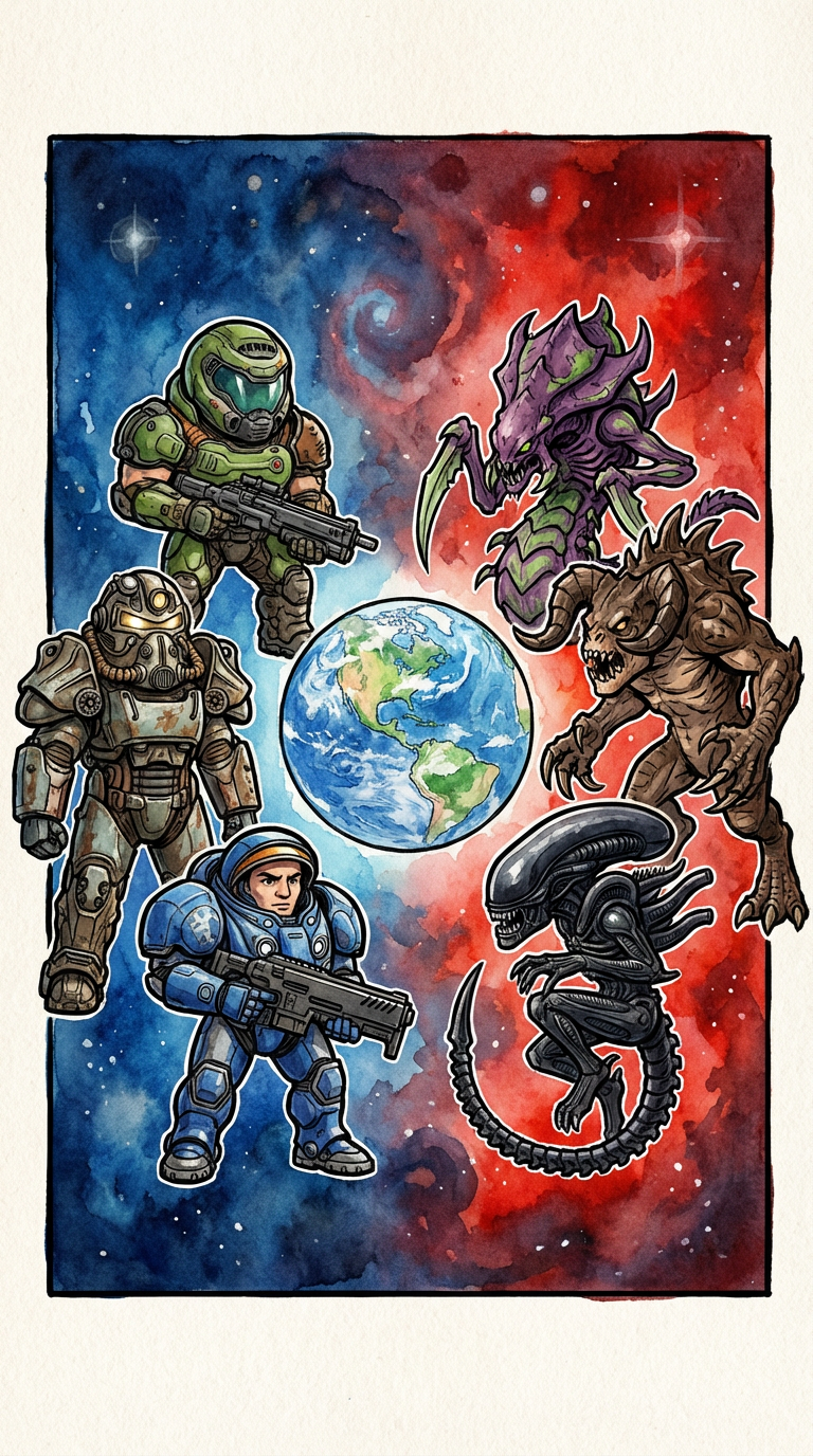 A colorful watercolor illustration depicting a cosmic conflict, centered around a small, detailed Earth. Six characters, three heroes and three monsters, are arranged in a circular formation around the globe. The heroes include a chibi-style space marine in green armor holding a rifle, a Fallout Power Armor figure, and a StarCraft Marine. The monsters are a xenomorph from Alien, a Deathclaw from Fallout, and a Zerg Hydralisk from StarCraft. The background is divided into a vibrant red and blue, with black outlines separating the characters and the central Earth. The art style is a blend of comic book and watercolor, with distinct black outlines and expressive character designs. Bright, even lighting highlights the characters and the Earth. The overall mood is action-oriented and dynamic.