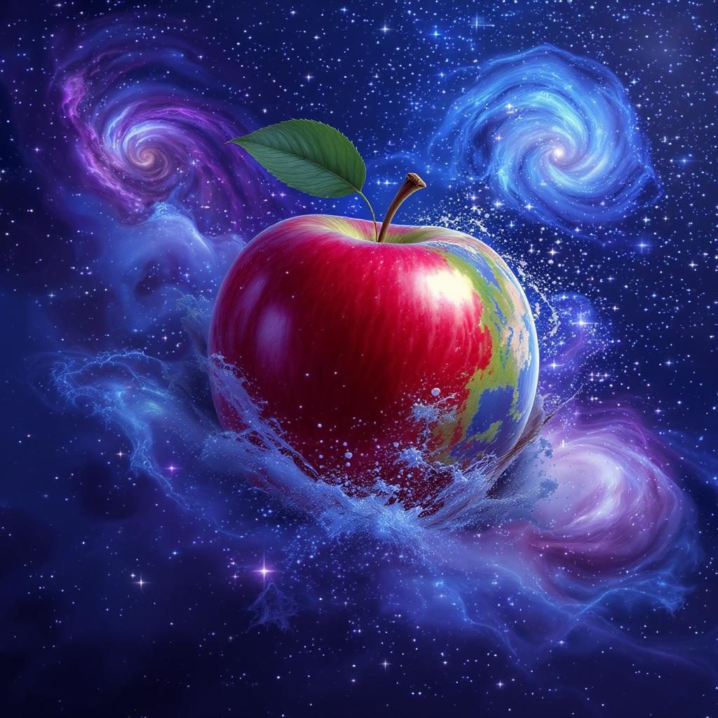 A colossal apple colliding with the earth amid swirling galaxies, bursting with vivid and surreal colors that highlight blues and purples, creating a cosmic, otherworldly ambiance. The scene embodies an abstract and dreamlike essence, where reality merges with fantasy in an ethereal tableau.
