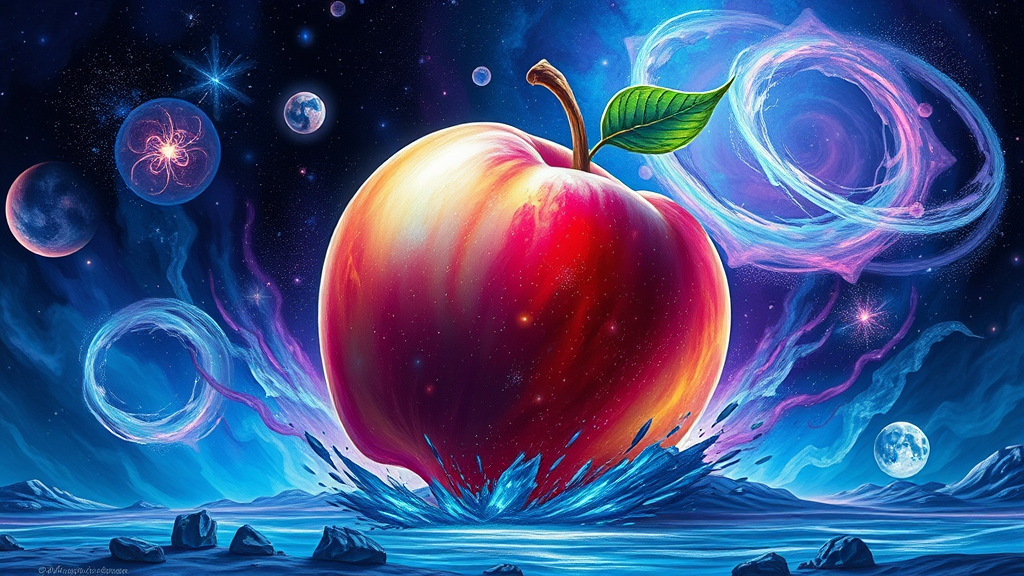 A colossal apple descends from the cosmos, colliding with the ground amid swirling galaxies, bursting with vibrant, surreal hues, emphasizing luminous blues and mystical purples. The scene is imbued with a cosmic and otherworldly atmosphere, featuring abstract, dreamlike elements that weave a tapestry of imagination.