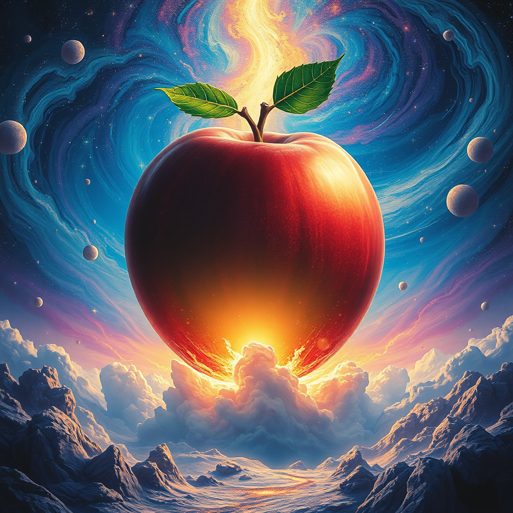A colossal apple descends upon the earth, the impact surrounded by swirling galaxies, vivid and surreal colors dominated by deep blues and ethereal purples. The scene exudes a cosmic, otherworldly aura, merging abstract and dreamlike elements into a harmonious spectacle. The composition is balanced with an interplay of light and shadow, inviting imagination to wander through this fantastical landscape.