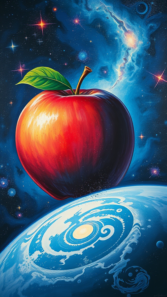 A colossal apple plummeting into the earth with galaxies swirling around it, painted in vibrant and surreal hues, focusing on deep blues and rich purples. This cosmic collision creates an otherworldly aura, blending the vastness of space with the dreamlike essence of abstract art.