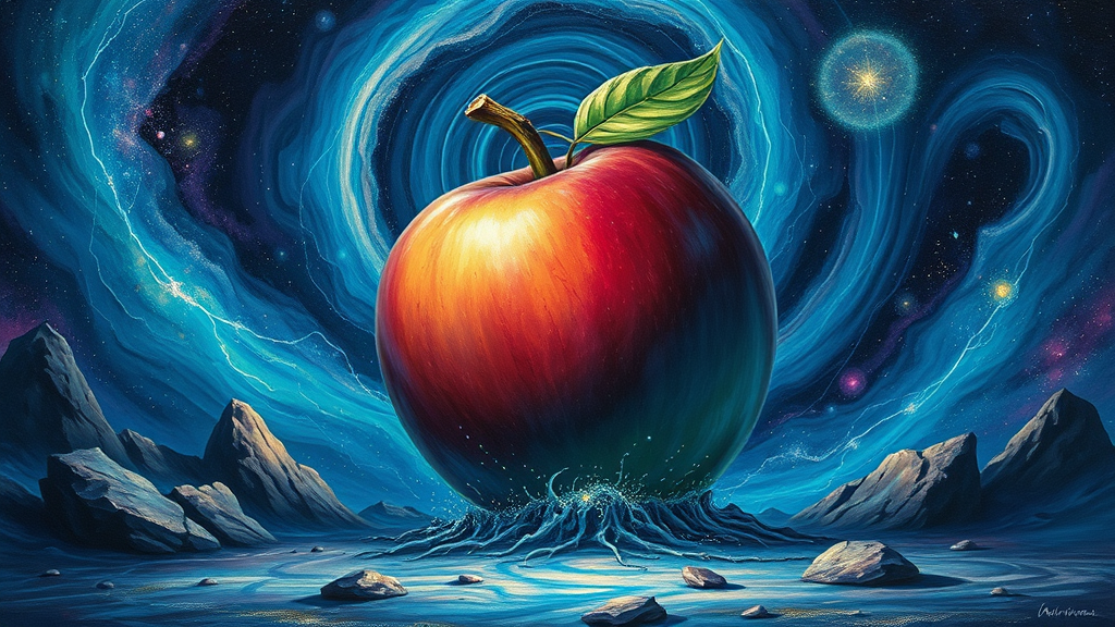 A colossal apple plunges into the ground, encircled by swirling galaxies, painted in vibrant and surreal hues dominated by blues and purples. It exudes a cosmic and otherworldly ambiance, blending abstract and dreamlike elements seamlessly. The scene captures an ethereal collision of celestial bodies, a harmonious dance of the universe in a mesmerizing spectacle.