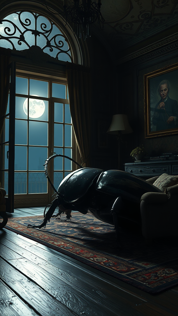 A colossal beetle measuring nearly two meters rests in a dimly lit room adorned with 1970s décor, viewed from the side. The vintage space features a wide window revealing a moonlit night, immersing the scene in an eerie glow. Intricate textures emphasize the masterpiece's haunting atmosphere, captured in sharp focus with extraordinary detail. The dramatic lighting casts long shadows, enhancing the rich tapestry of this surreal digital art piece, crafted in a fantasy style with a vivid 4k resolution.