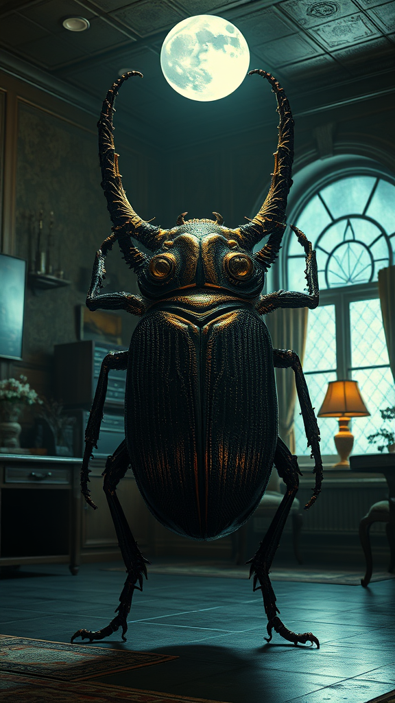 A colossal beetle measuring two meters in length stands in a dimly lit room adorned with vintage 1970s decor, its intricate exoskeleton glistening under the moonlight streaming through a window. The scene captures a haunting, surreal atmosphere with its rich textures and dramatic lighting. Every detail is sharply focused in this 4k digital art piece, embodying a fantasy style that elevates the eerie yet captivating aesthetic.