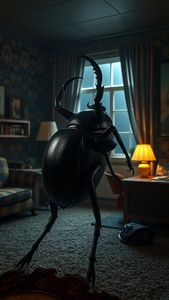 A colossal beetle, nearly two meters in length, resides in a dimly lit room adorned with 1970s decor. The side view captures its dark, glistening exoskeleton against a backdrop of retro furnishings. Through a window, the night casts an eerie glow, enveloping the scene. Rich textures bring the room to life, from the paisley wallpaper to the shag carpet, creating a haunting atmosphere. The composition focuses sharply on the beetle, with dramatic lighting enhancing its features. The digital art, rendered in a fantasy style, offers stunning high detail in 4k resolution, evoking a sense of wonder and unease.