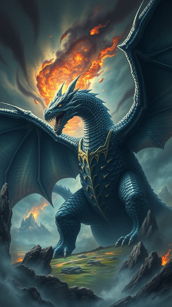 A colossal black dragon named Zoddrened, the harbinger of shadows, poised to unleash a massive inferno from its open maw. This scene captures the essence of a terrifying yet mesmerizing beast in striking detail and hyper-realism, inspired by the style of a Yu-Gi-Oh monster. Its scales glisten with a daunting sheen, each one meticulously rendered to evoke awe and fear. The backdrop is a swirling storm of dark clouds, highlighting the dragon's immense wingspan and menacing presence. The surrounding landscape is dwarfed by the titan's size, conveying a sense of both power and majesty.