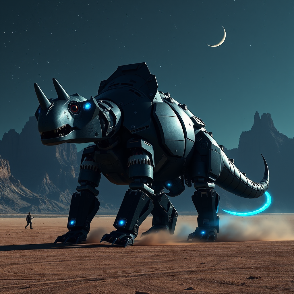 A colossal black triceratops robot with glowing neon blue eyes stands majestically in a vast desert, surrounded by towering rock mountains under a starry night sky. A crescent moon casts subtle shadows on the landscape, enhancing the cinematic majesty of the scene. The robot's reflective armored plates glimmer with hints of silver in the moonlight, adding an element of hyper-realism to this 8K HDR masterpiece. Mysterious dust clouds dance around its feet, while a trail of faint blue energy pulses through its mechanical limbs, creating an aura of untamed power and awe within the tranquil wilderness.