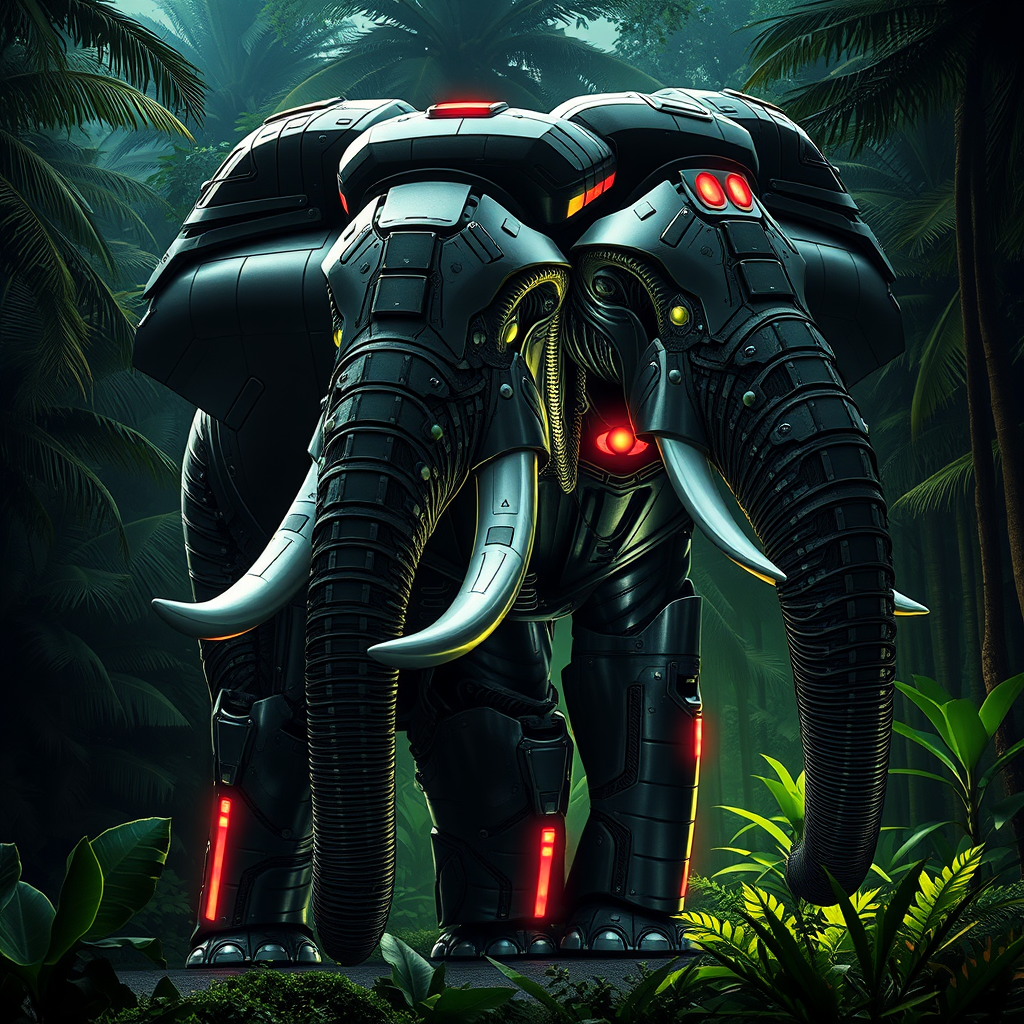 A colossal cyberpunk elephant clad in sleek, futuristic battle armor stands majestically, its silhouette illuminated against a dense tropical forest backdrop. The play of light and shadow casts intricate patterns across its metallic skin, reminiscent of a masterful chiaroscuro sgraffito, with hints of neon hues glinting off its armor in stark contrast to the lush green foliage.