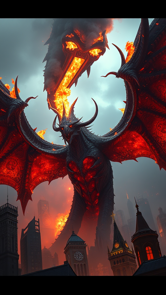 A colossal Deathwing ablaze, towering over the city with fiery tendrils licking the sky, crafted in the style of zbrush with a nod to referential painting; its surface is adorned with spiky mounds of dark bronze and vivid red, captured in meticulous detail. The scene embodies the essence of crowcore with exaggerated expressions, showcasing a stunning masterpiece reminiscent of Bayard Wu's artistry. Subtle creative twists include the incorporation of ethereal shadows dancing within the flames and a hint of ancient runes etched upon the beast's scales, adding layers of mystery to the dramatic tableau.