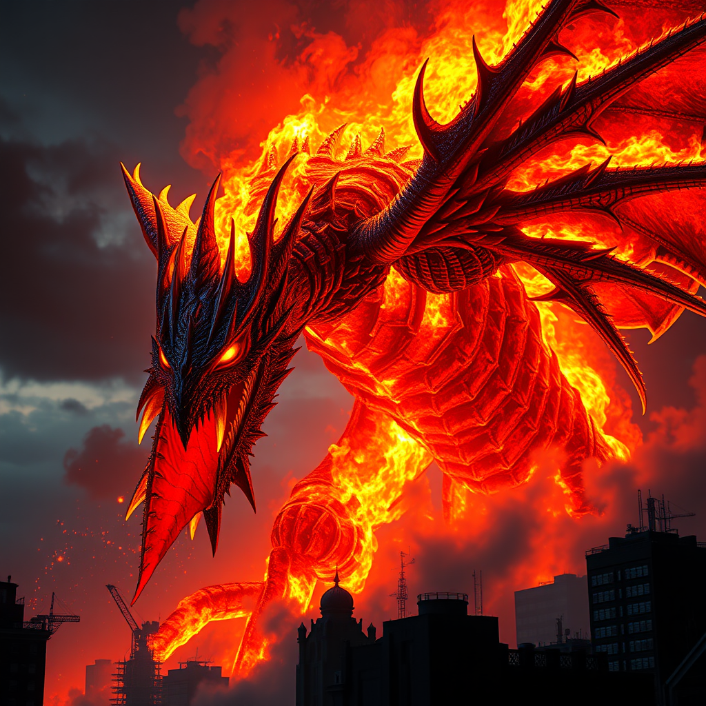 A colossal Deathwing engulfed in flames towers over the cityscape, its fiery breath illuminating the night sky in brilliant shades of orange and red. The creature's spiky mounds and dark bronze scales shimmer menacingly, each detail meticulously rendered with a sharp focus reminiscent of ZBrush craftsmanship. With exaggerated expressions of rage and power, the Deathwing's eyes burn like molten lava, contrasting with the crowcore aesthetic of shadows and mystery surrounding it. Inspired by the stunning art of Bayard Wu, this awe-inspiring scene captures the raw intensity and untamed energy of a mythic beast amidst an inferno, where every detail tells a tale of destruction and grandeur.