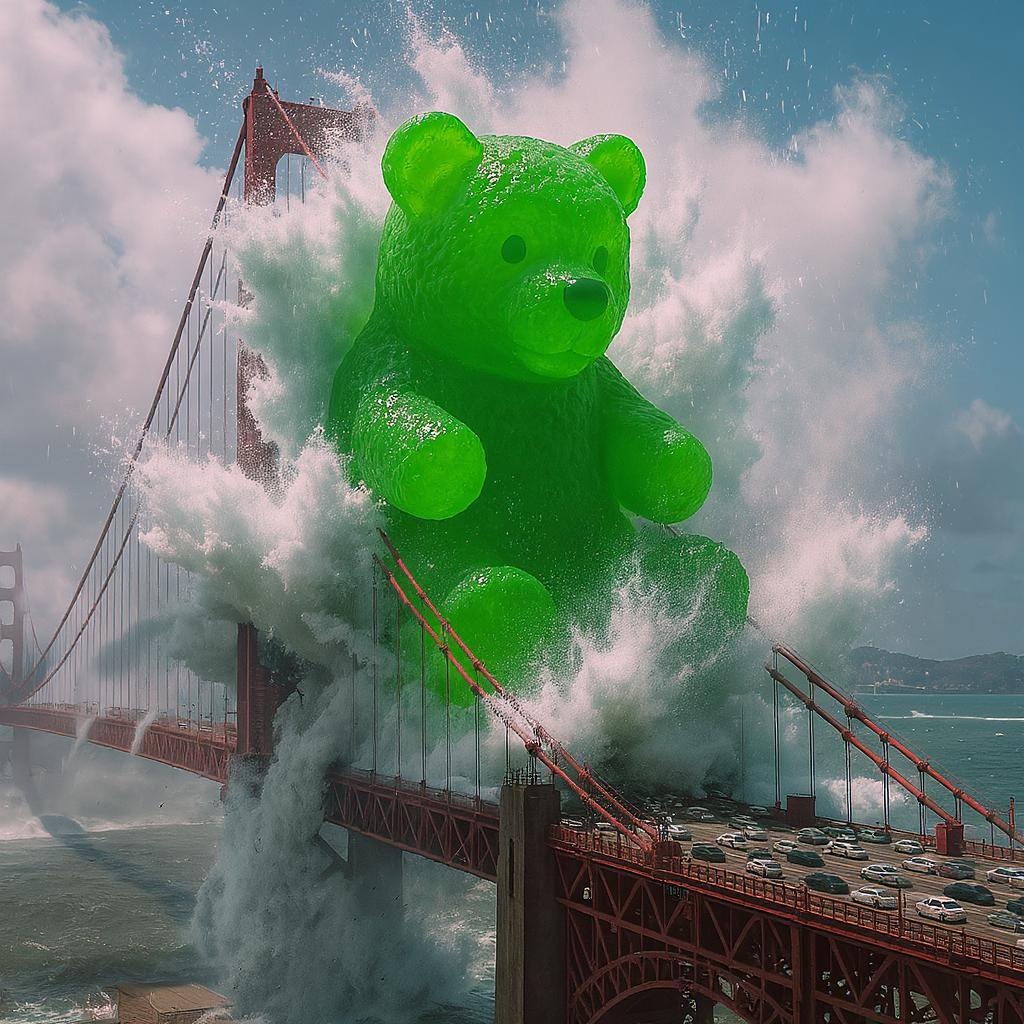 A colossal emerald-hued gummy bear rampages through the Golden Gate Bridge, creating chaos and gridlock, as towering waves crash against the pillars and vehicles scatter like ants amidst the destruction, casting a surreal, cinematic doomsday over San Francisco.