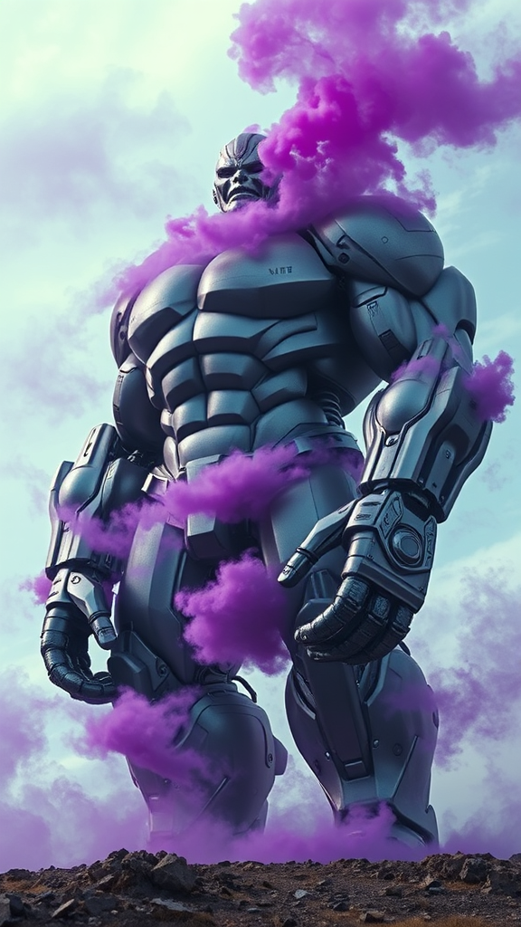 A colossal figure emerges, its massive, muscular form towering over the landscape. Enveloped in swirling purple smoke, this half-robot, half-hulk creation blends the raw power of organic muscle with the sleek, formidable presence of advanced robotics. The vibrant haze dances around its metallic limbs, reflecting off polished surfaces, contrasting with the organic texture of its skin. The awe-inspiring sight captures an essence of strength and technological innovation, set against a backdrop that highlights its enormous, imposing size in breathtaking 4k detail.