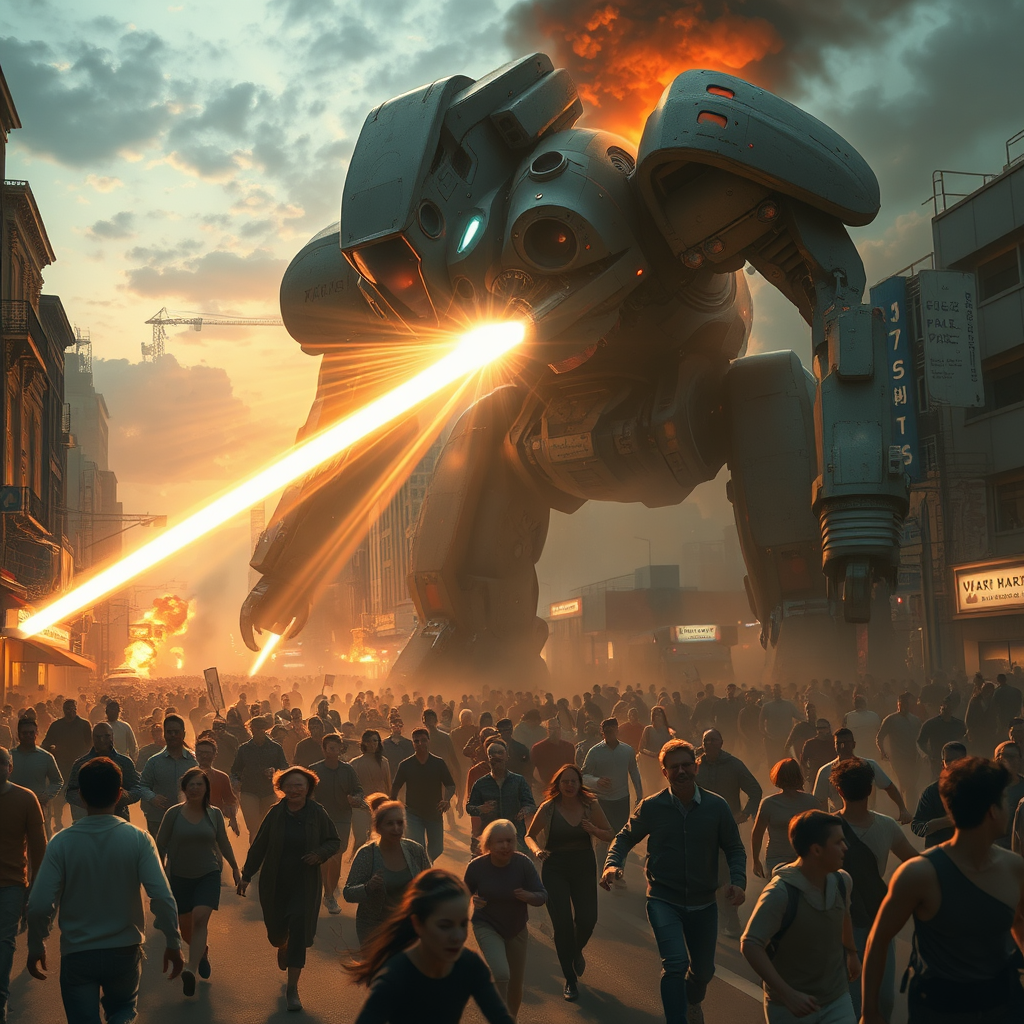 A colossal futuristic cybernetic mecha, exuding an ominous presence, unleashes a massive, radiant laser beam from its head toward a frantic crowd of terrified people, running and screaming through a bustling city street as evening descends. The scene is chaotic, with explosions and thick clouds of dust and smoke filling the air, reminiscent of a 'War of the Worlds' scenario. This cinematic depiction, rendered in hyper-realistic detail, features vibrant colors, smooth gradients, and striking contrasts, evoking the signature styles of Craig Mullins and Thomas Kinkade. An overlay of text, watermark, and artist signatures subtly imprints elements of art and copyright, adding depth to the visual narrative.