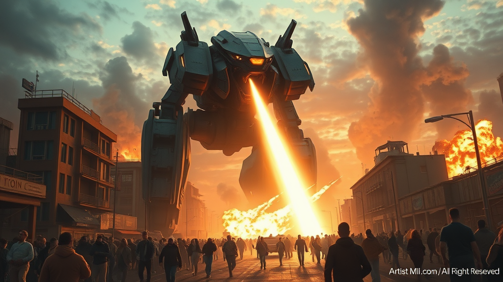 A colossal futuristic cybernetic mecha, towering and ominous, unleashes a massive laser beam from its head, cutting through a crowded city street filled with terrified, fleeing people. The scene is set in the evening under a chaotic sky, with explosions and dust clouds filling the air, evoking a war of the worlds atmosphere. The environment is depicted in cinematic hyper-realism with high detail and vibrant colors. Smooth gradients and high contrast accentuate the drama of the scene, reminiscent of the evocative styles of Craig Mullins and Thomas Kinkade. Text and watermark read: "Artwork by [Artist Name], © [Year], All Rights Reserved."