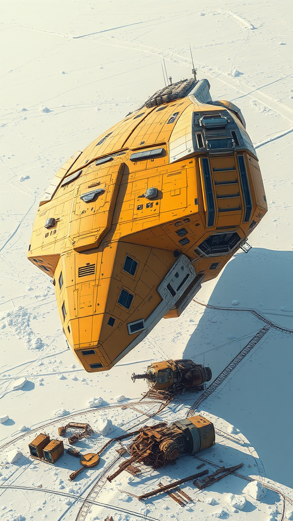 A colossal futuristic spacecraft drifts above a vast expanse of snow and ice, its surfaces shimmering with warm hues of yellow and beige, reminiscent of ancient fantastical ruins. The grandeur of its scale is awe-inspiring, with intricate industrial details etched into every panel, echoing the style of Viktor Vasnetsov's mythical landscapes. The ship's majestic form and modular construction suggest a world of detailed world-building, reminiscent of Dariusz Klimczak's imaginative intricacies. Rusted debris surrounds its base, telling the tales of past exploits, while the imposing monumentality of the vessel casts long shadows upon the icy terrain, evocative of Leszek Bujnowski's and Alexei Harlamoff's masterful artistry. This high-definition masterpiece brings to life a scene of otherworldly beauty and history.